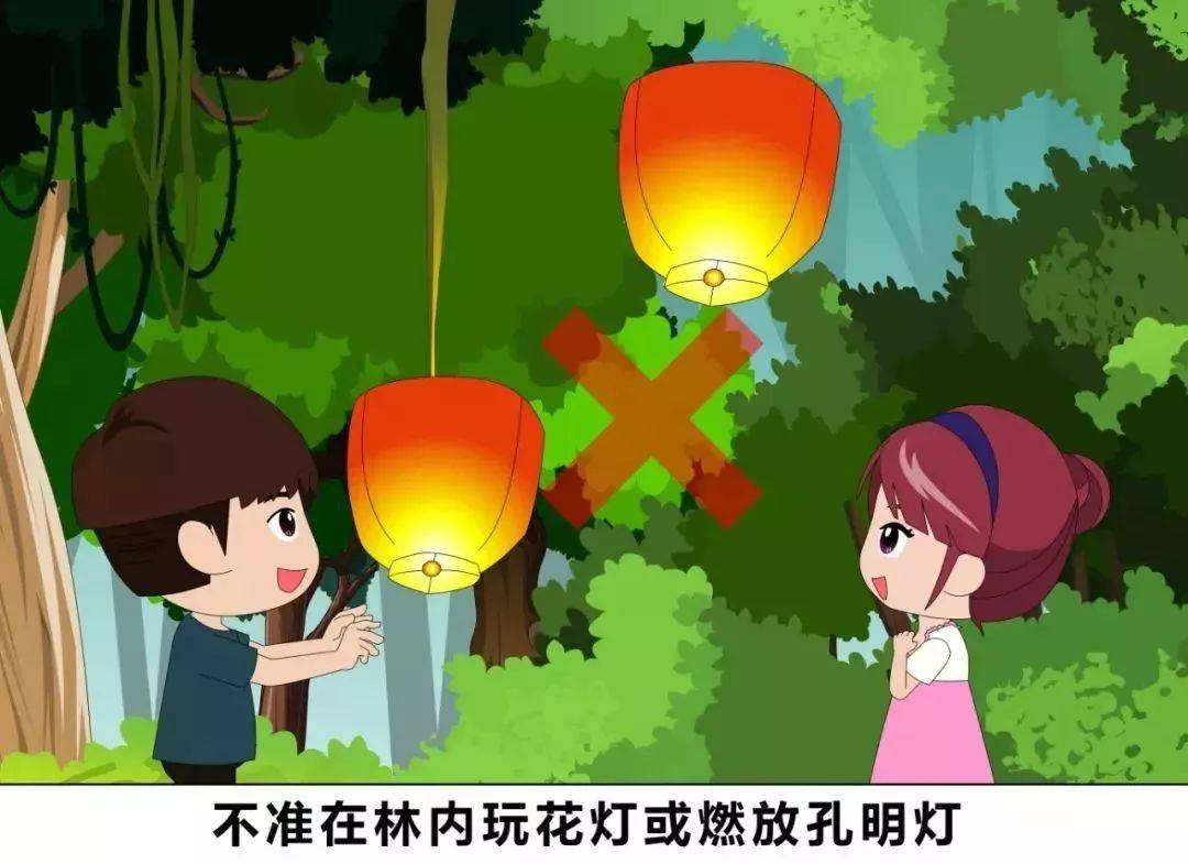 不準(zhǔn)在林區(qū)里玩花燈或者燃放孔明燈,孔明燈雖然可以飛得很高很高,但是也很容易被林內(nèi)的樹(shù)枝攔下,從而引發(fā)可怕的森林大火!